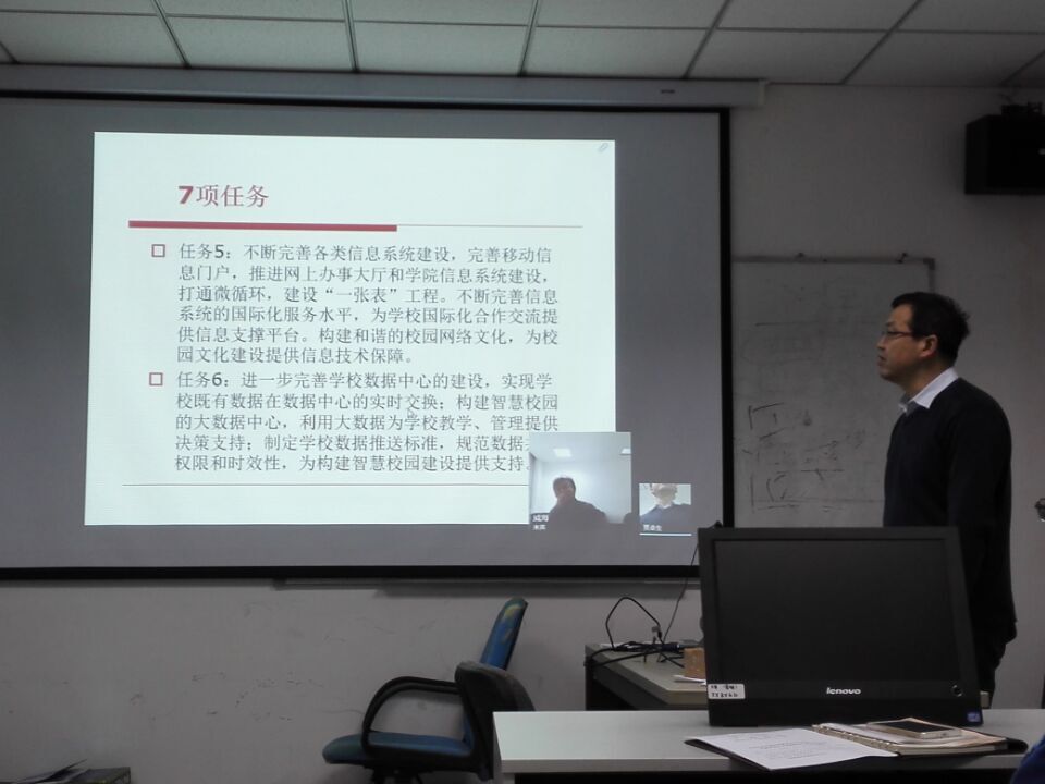信息化办公室主任贾卓生对我校“十三五”信息化专项规划的制定背景、过程进行了简要说明,重点对五年规划中的7项主要任务和9项具体措施等内容进行了详细解读,并对大数据中心的建设思路进行了阐述。